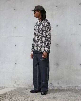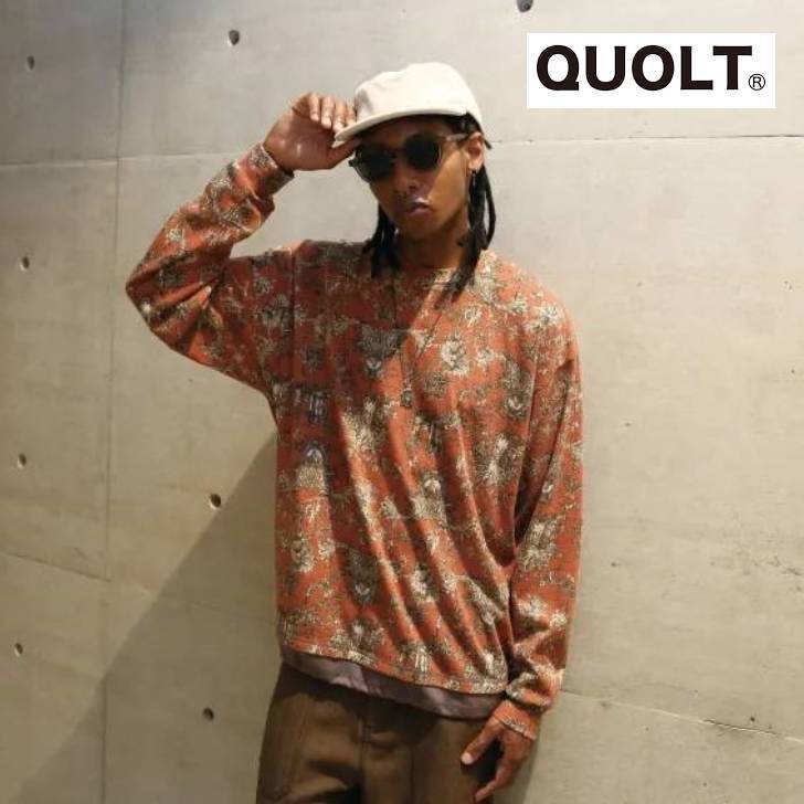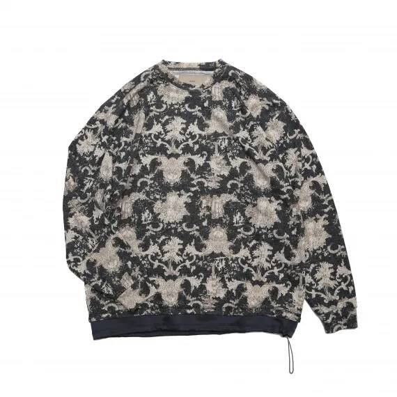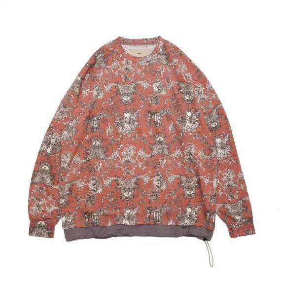 裾をレイヤード状に切り替えたリラックス感のあるニット。裾のドローコードでシルエット、着丈に変化をつけることが可能。色味を抑えた西洋美術柄がコーディネイトのアクセントとして取り入れやすく、ニット特有のやわらかな印象も魅力です。