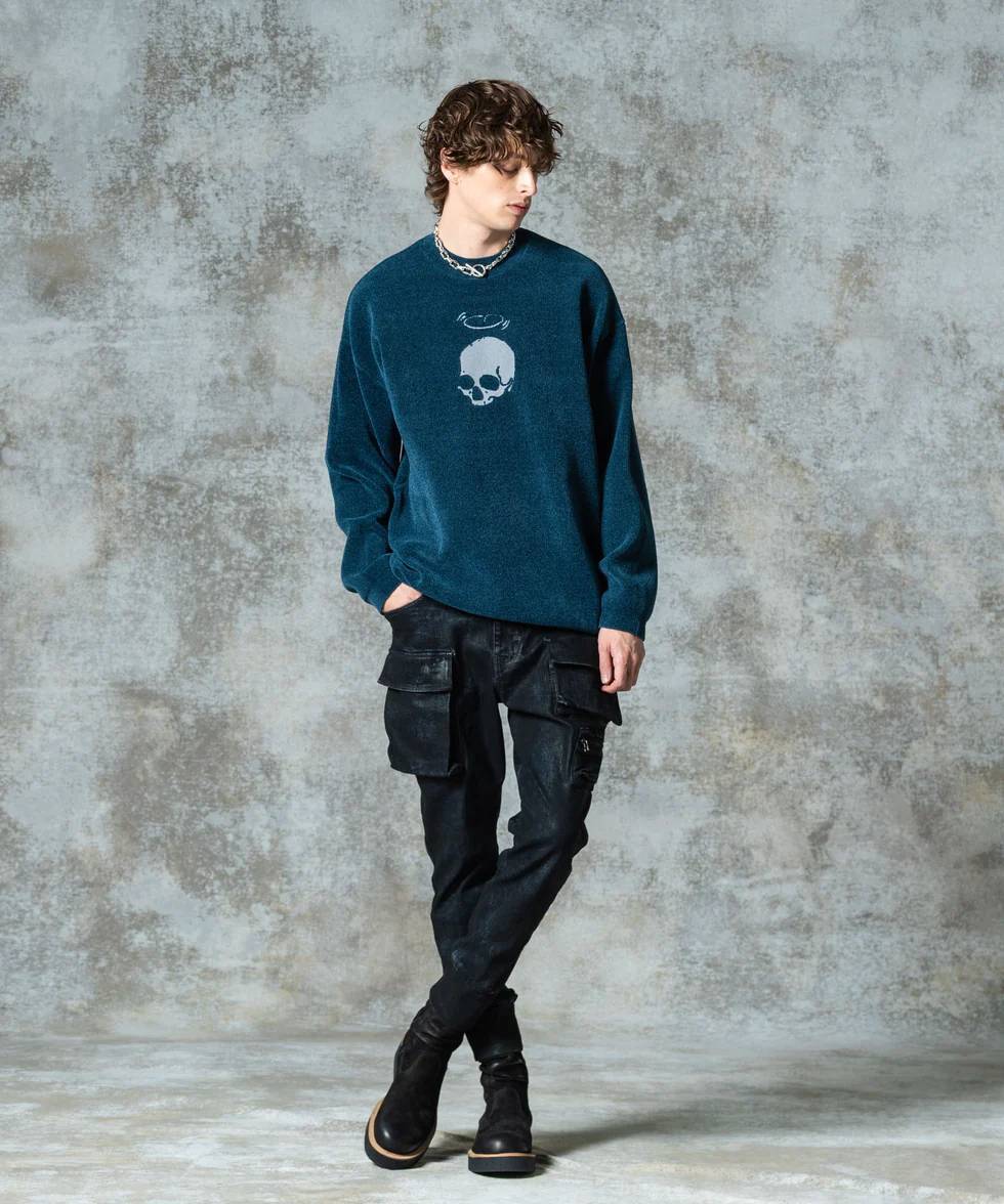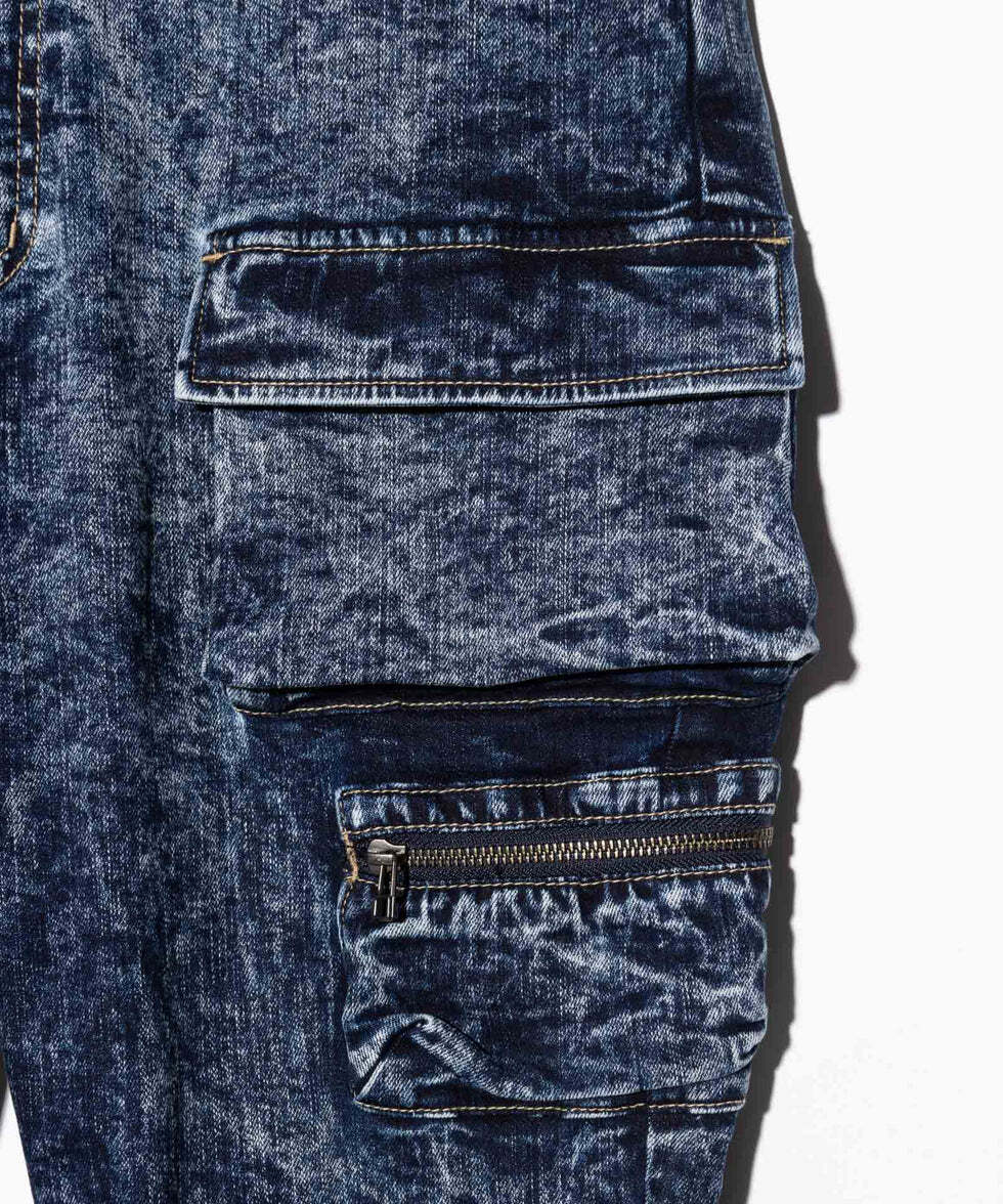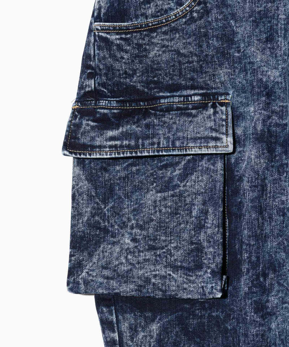 glambの既成概念に捉われないパターンメイキングを巧みな素材加工と掛け合わせ、ソリッドなミリタリースタイルを提案するParaffin Cargo Denim。ストレッチデニムのボディは、ゆとりある腿周りから膝下にかけてタイトに絞りを加えたサルエルテーパード。裾にはリブを配することでエッジィな輪郭にさらなる緩急を持たせています。ボディ左のカーゴポケット下部に配されたジップポケットはアシンメトリーなバランス感でビジュアル変化を生み出すアクセントに。カラーバリエーションはケミカルウォッシュを施したIndigoに加えて、さらなるブランドの独自加工を施したBlackにもご注目。溶剤と顔料を吹き付けてパラフィンコーティングによるオイルドジャケットのような、ムラ感を浮かべた味のある黒の風合いをお楽しみいただけます。