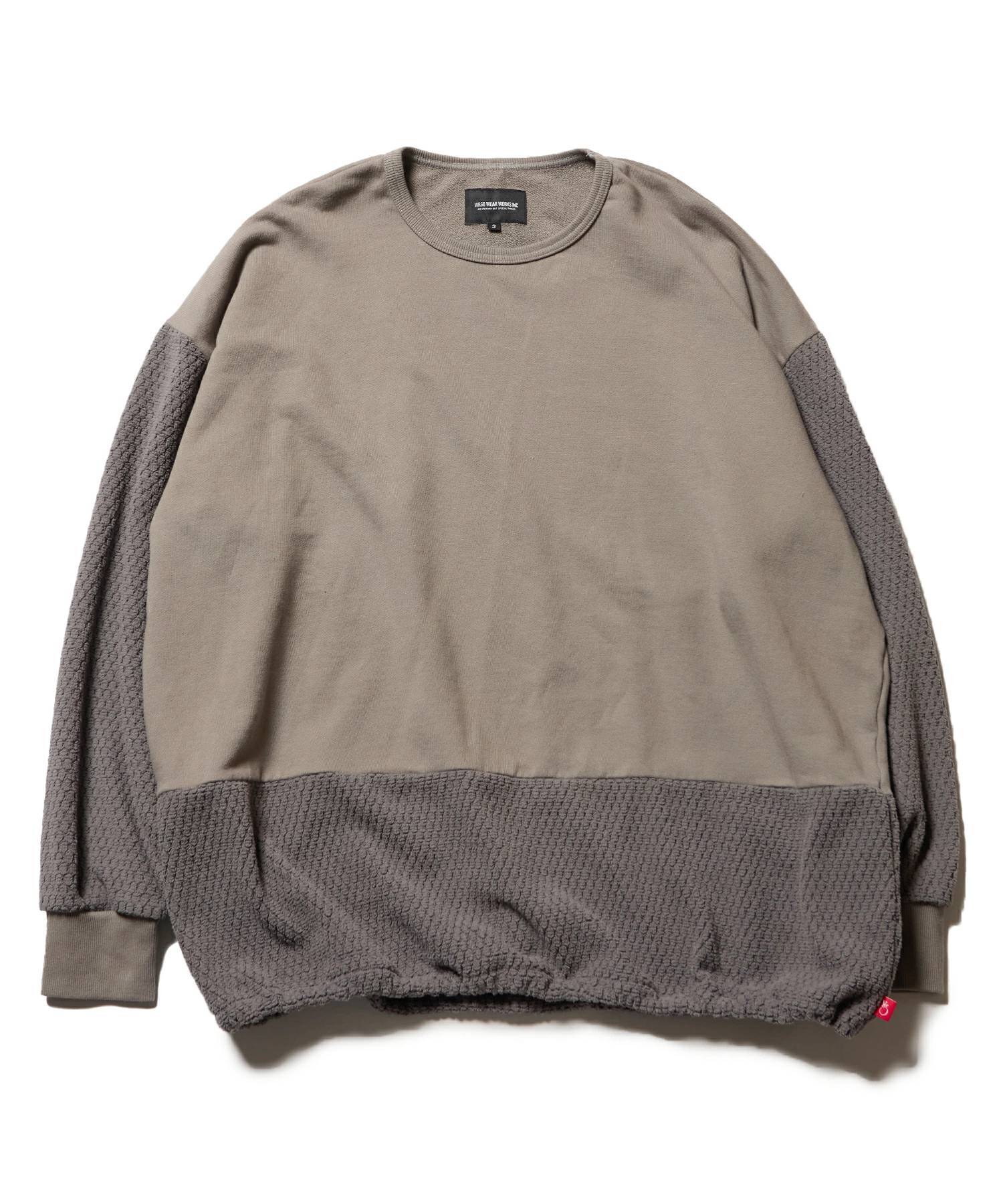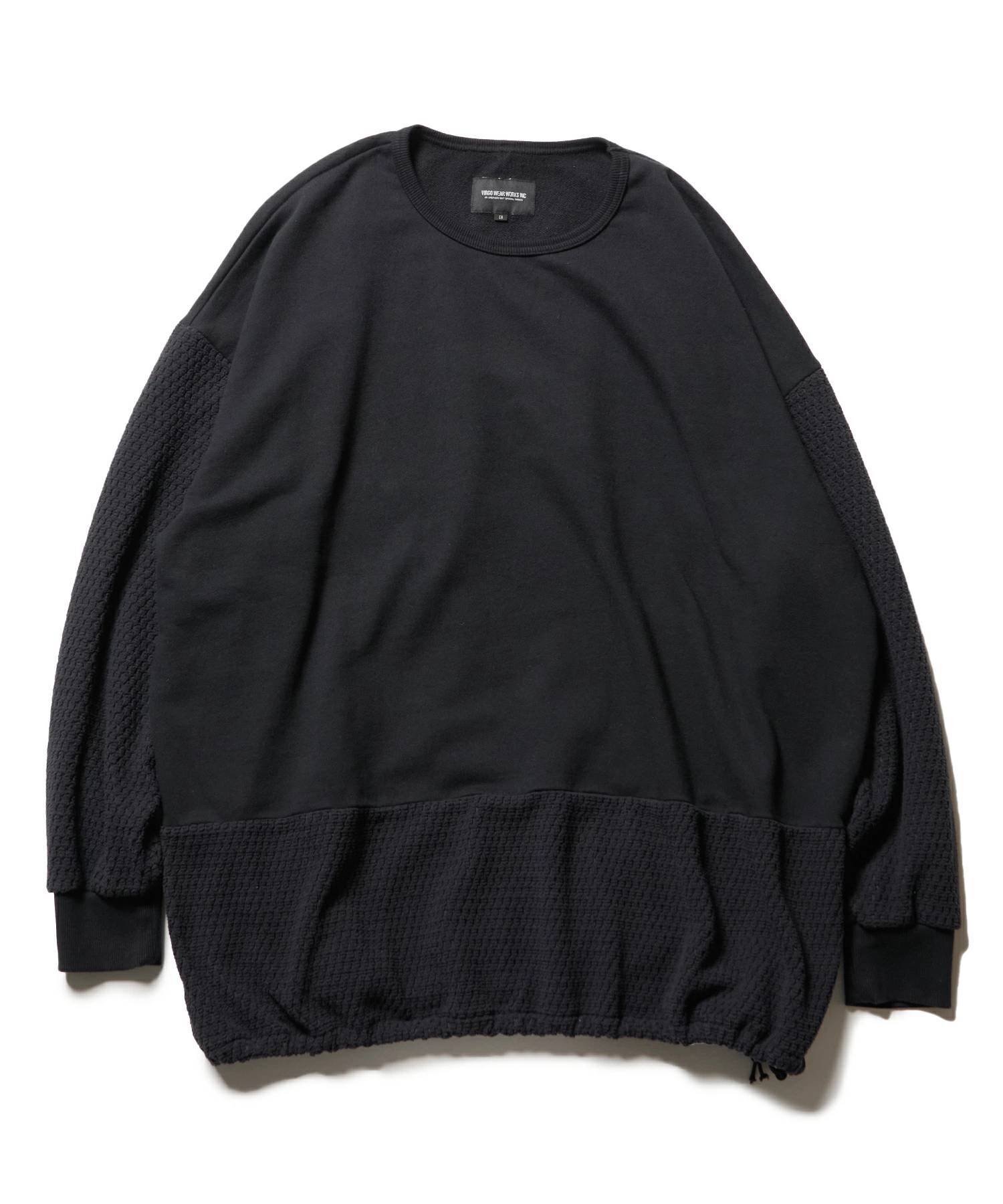 裏毛とフリースをMIXさせたクルーネックスウェット。ダイヤ型のフリースを袖やフロント下部に配置し、オリジナリティあるデザインに。裾はアジャスターが搭載され絞れる仕様になっているところもポイントです。