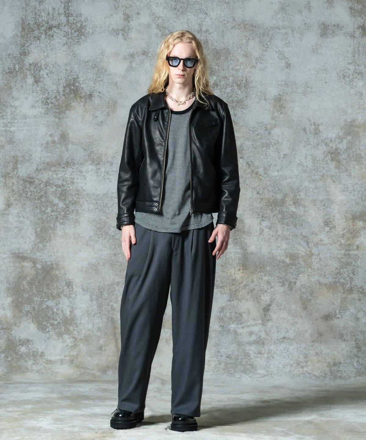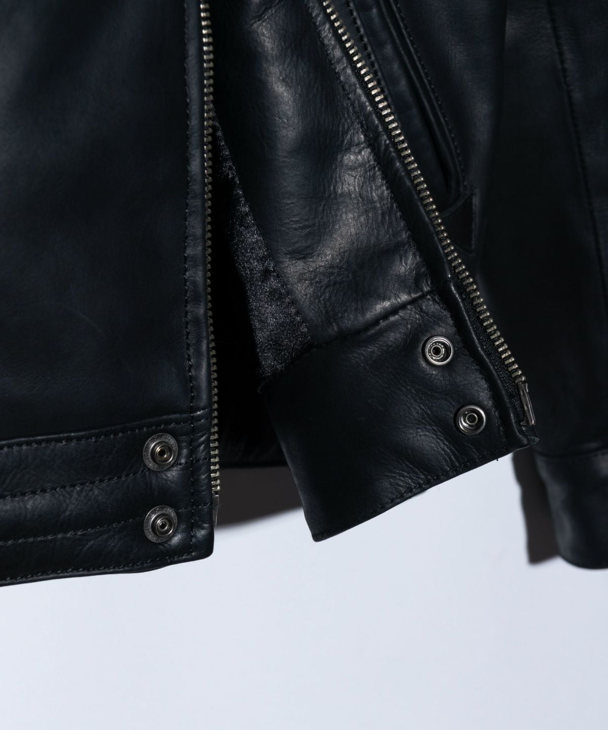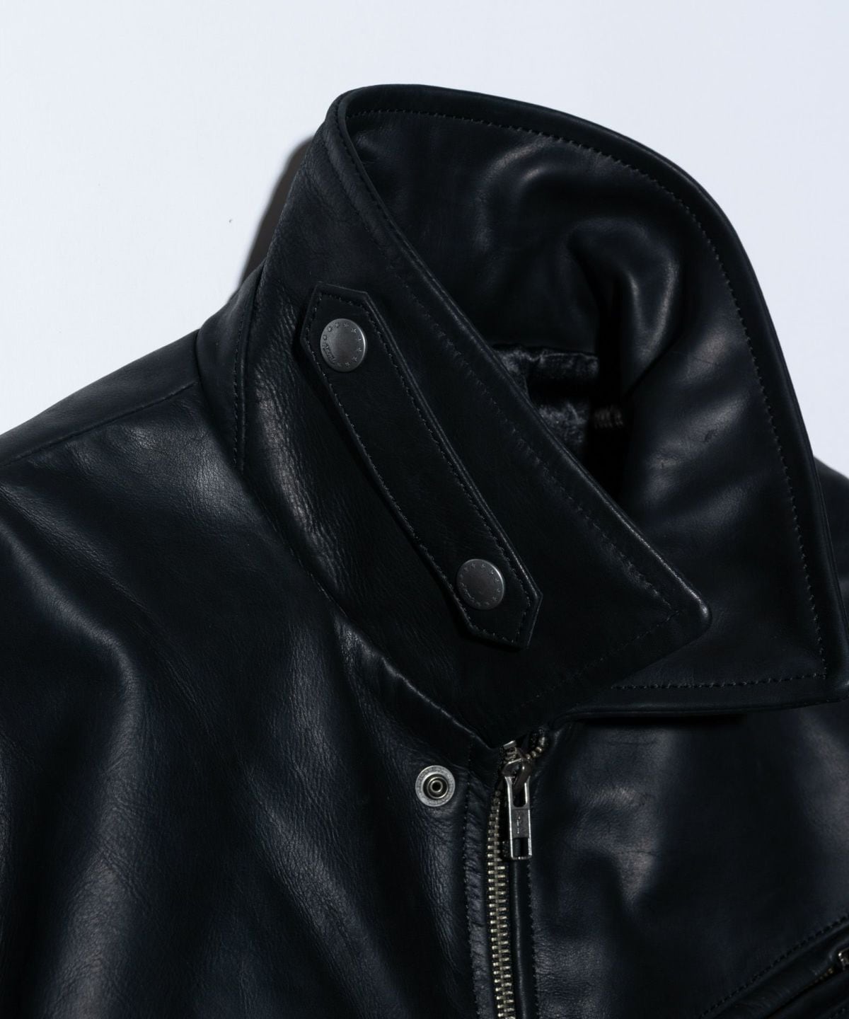 レギュラーカラーを備えたシングルタイプのボディはショートな着丈にまとめたヴィンテージスタイル。大ぶりなカフスや補強ステッチを走らせたウエストベルト、サイドのアジャスターなどラギッドなディテールを散りばめながら、腰のポケットはクレセントポケットであしらうことで旅情あるニュアンスを加えています。そこに落とし込まれたのがブランドが厳選した2種のカウレザー。Blackは革本来の風合いを楽しめるフルベジタブルタンニン鞣しのカウキップを使用。仕上げにオイルワックス加工を施したマットでしっとりとした革質が魅力です。Brownはブラウン染色したレザーを上からさらに黒染めした茶芯仕上げの革を使用。製品洗いを施すことでアタリを刻み、地の色がところどころ覗くワイルドな表情が特徴です。また細部の仕様においてもスタイリングのアレンジに幅を持たせるディテールを随所に内蔵。気分や天候に応じたスタイリングが可能です。