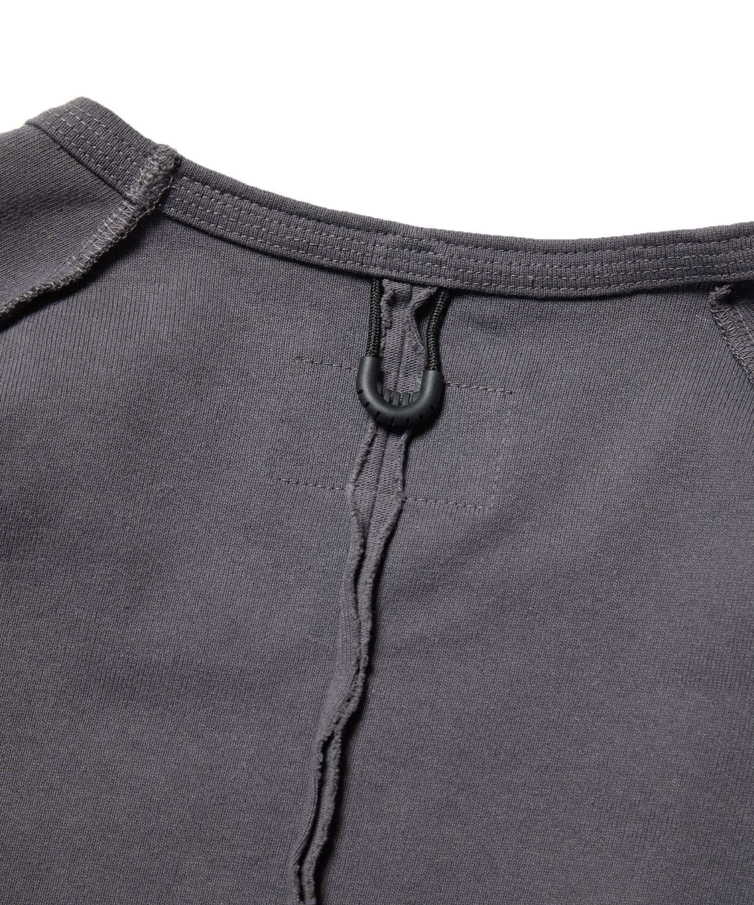 超度詰め天竺を使用したカットソー。あえて縫製の始末を表に見せることで、裏返しのような斬新なデザインを演出。袖は何重にも重ねた断ち切りデザインがアクセントになり、着るだけでさりげないおしゃれを演出します。周りと差をつける、大人の遊び心を感じる一枚です。