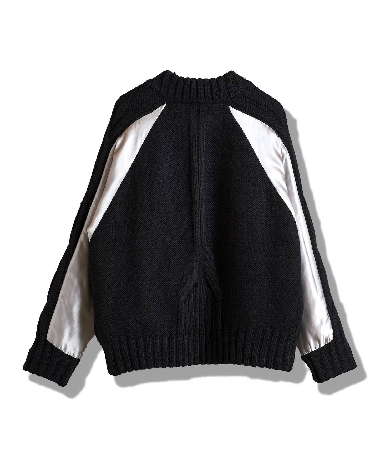 ニットとサテン生地をドッキングした異素材コンビが目を引く、上品さとモード感を併せ持つ新感覚のニットブルゾン。