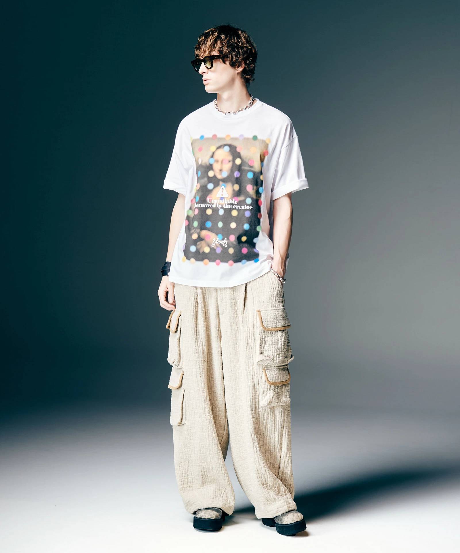 古今のアートをモチーフにウィットあるグラフィックを描いたUnavailable Art T-Shirt。フロントにぼやけて見えるのは世界一有名な女性の肖像とブリティッシュモダンアート、一見スキャンダラスながら「クリエイターにより撤去されました」とした発泡プリントによるコーションマークが。アートシーンに対するブランドからの示唆を込めた1枚です。テキスタイルに用いたのはコットン100%の5.6オンスミディアムウェイト天竺。フィッティングは身幅広め、着丈長めのビッグシルエットとなっております。