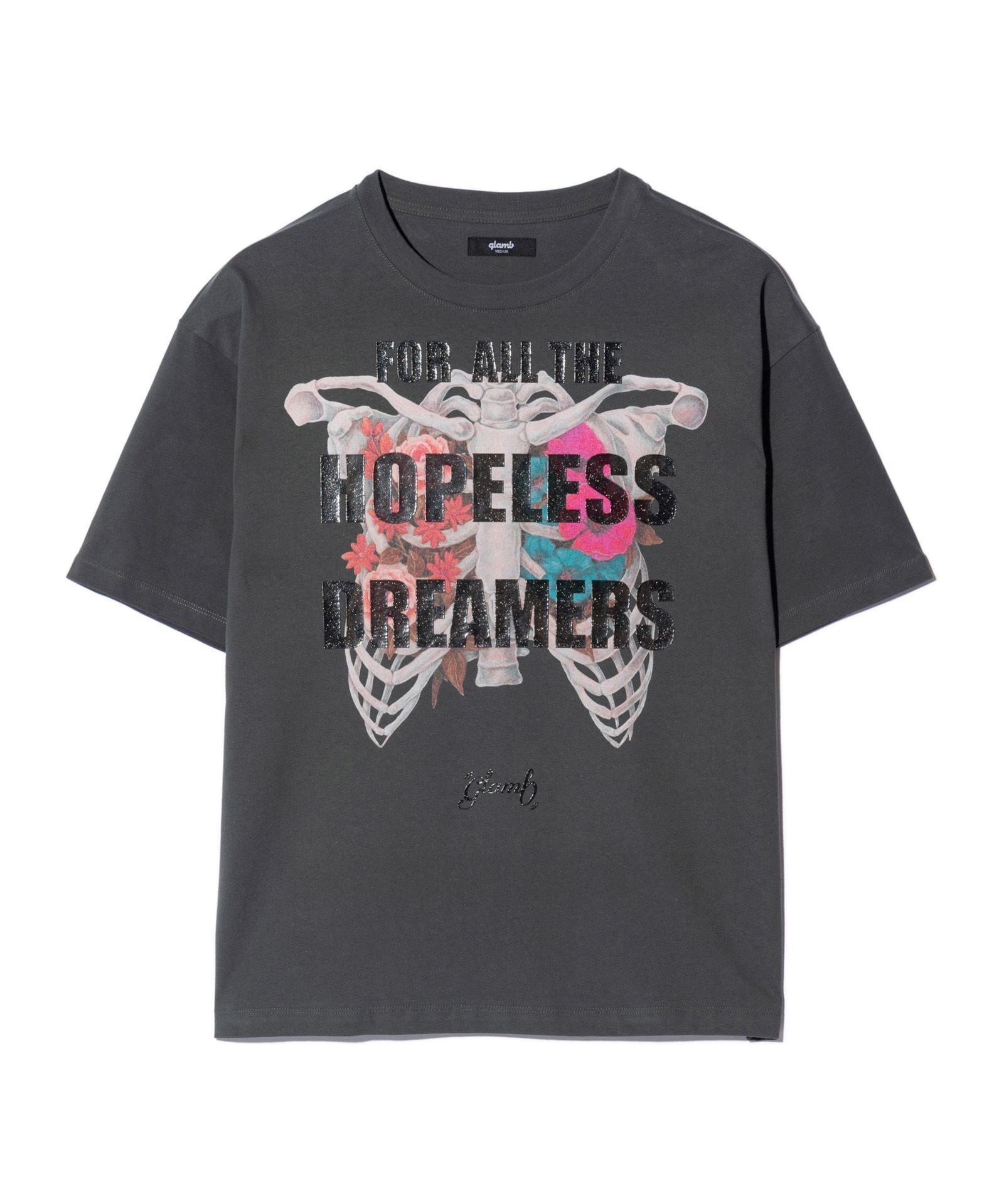 アンダーグラウンドなグラフィックにリュクスな異素材使いを潜ませたWandermore T-Shirt。フロントのコントラストあるグラフィックは、肋骨のモチーフと色鮮やかな花々。メッセージを上段に重ねてスタイリングをまとめやすいバランスに仕上げています。ロゴは半透明のグリッタージェルであしらったもの。艶やかなテクスチャと透かし柄の掛け合わせがグラフィックを重層的に構築します。テキスタイルに用いたのは表面の毛羽立ちを極限まで抑えて上質で滑らかな肌触りをもたせたコットン100%コンパクトコーマ。身幅にゆとりを持たせたルーズフィットは抜け感ある着こなしを演出します。