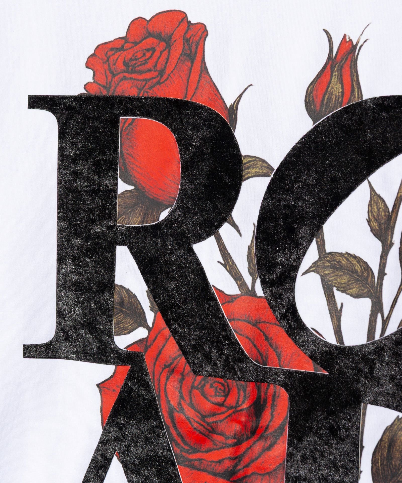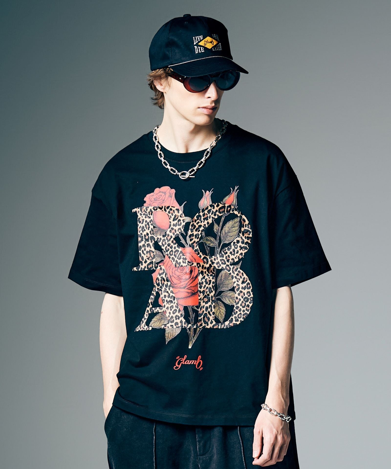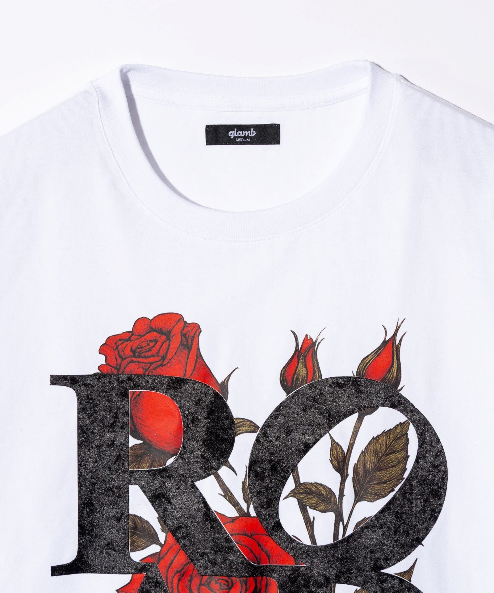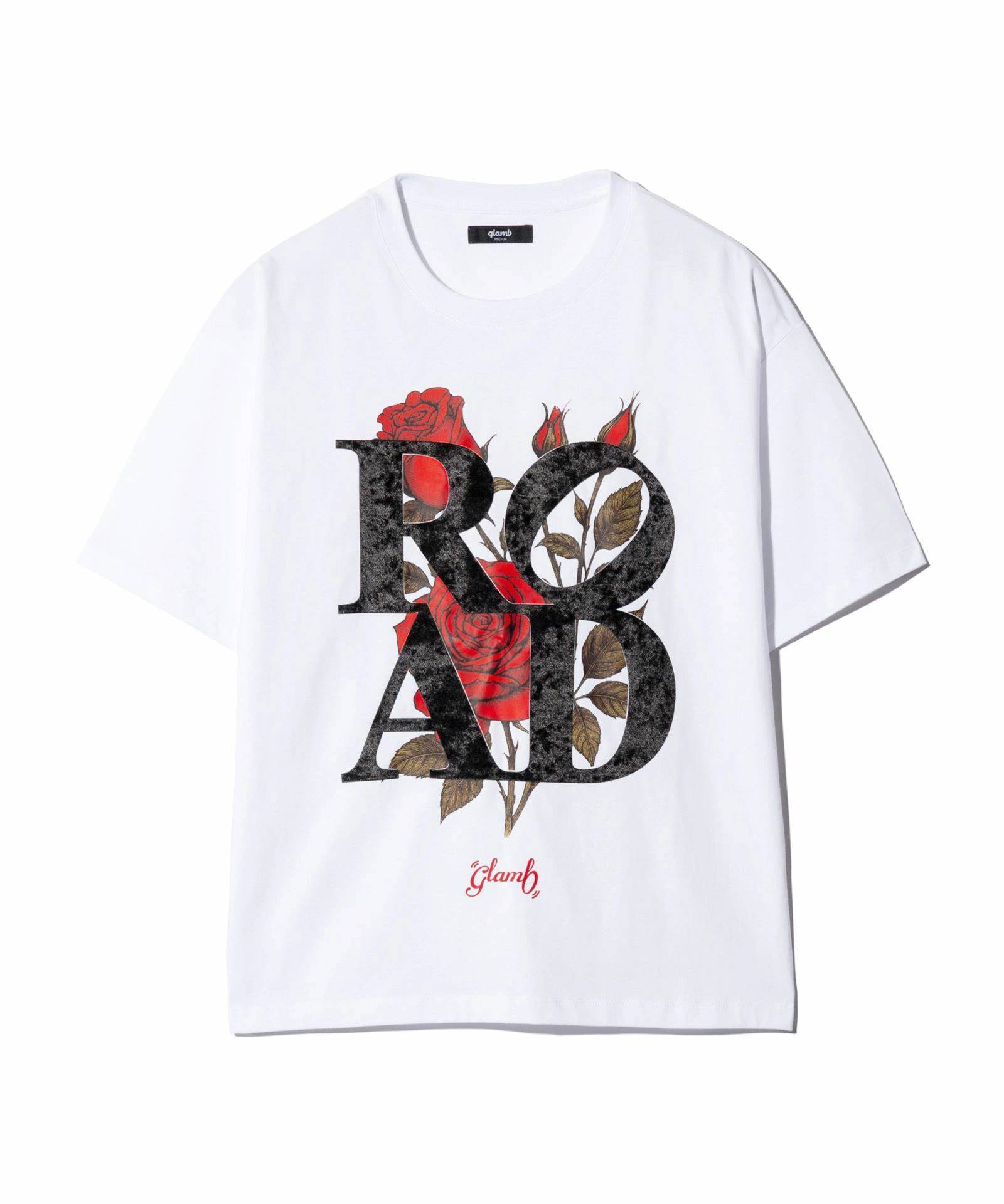 glambカットソーの人気シリーズであるベロアボンディングTシャツの新たな顔となるVelour Road T-Shirt。身頃にベロア生地であしらわれた4文字は旅人や夢追い人をイメージしたメッセージ。インクを直接プリントしたフィルムを転写するDTFプリントによって鮮やかに発色させた薔薇のモチーフの上に重ねることで、ロックマインドある異素材デザインにまとめました。テキスタイルにはコットン100%のコンパクトコーマ糸を使用、毛羽立ちの少ない素材が滑らかで上質な着用感をもたらします。