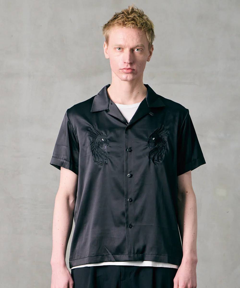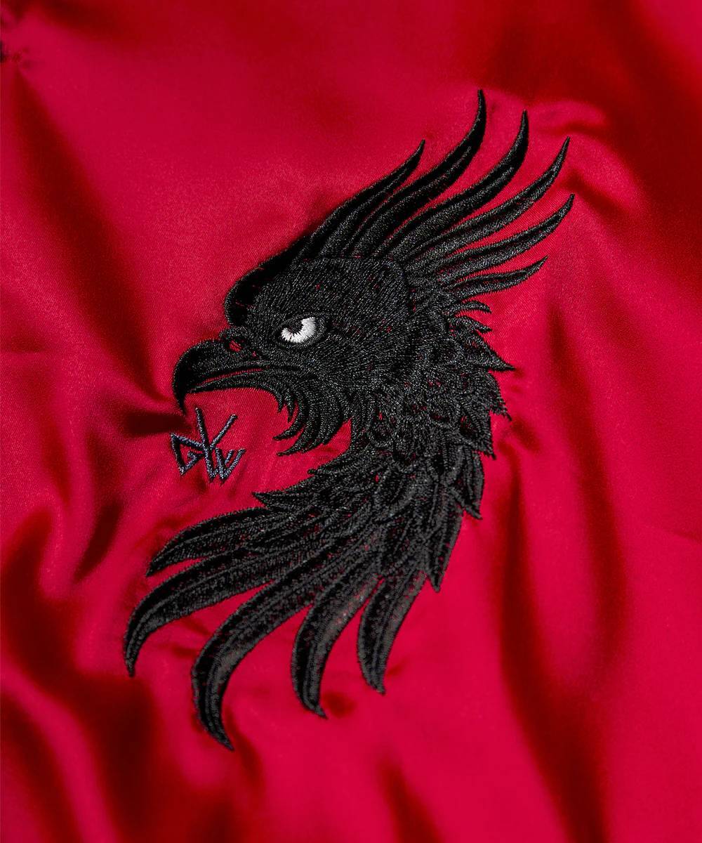 背中にはブランド名をチェーンステッチで、フロントには黒糸で表現した鳳凰刺繍を施した上品な一着。